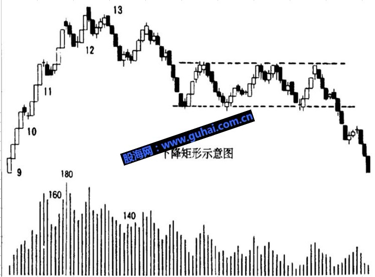 (1)特征:矩形是由一连串横向的股价变动所形成,其变动之上限与下限皆呈水平状,成交量变动则随着形态的发展愈来愈小。向矩形上方突破时亦须有大成交量配合,向下突破则不一定出现大成交量。