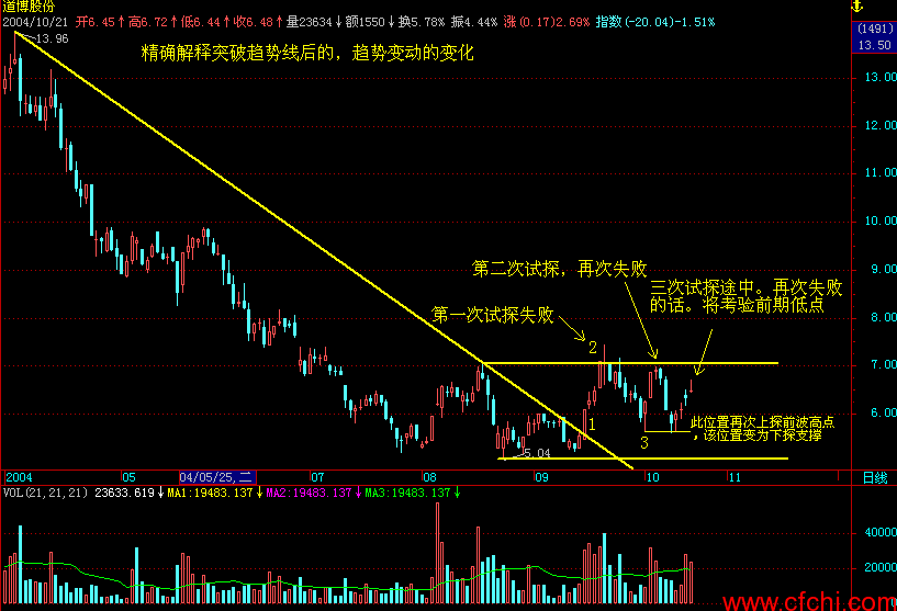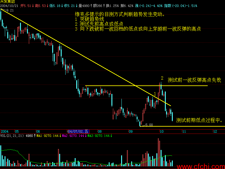 3、在下降趋势中,价格向上穿越先前的短期反弹高点;或在上升趋势中,价格向下穿越先前的短期回档低点。