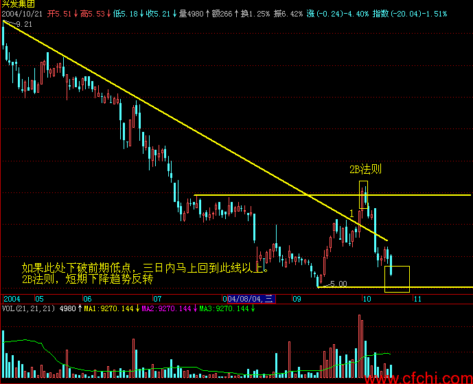 2B法则:在上升趋势中,如果价格已经创新高而未能持续挺升,稍后又跌破先前的高点则趋势可能会发生反转。下降趋势也是如此。