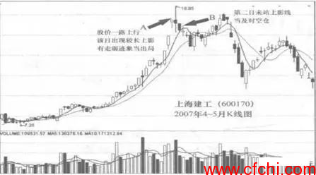 上图中A:2007年5月9日,在做多者的追捧下,前期股价在上升通道中一路攀升,市场人气较为活跃。该日股价高开,随即缓步走高,追风者跟入成交量放大后,股价开始走低,主力满足了所有“排队”的买盘,当日K线留下了394以上的上形线,我们称这个形线为“朝天一柱香”,这日就说明股价有走弱的迹象,可以考虑出局,但也可以观察一下,明日再做决定。