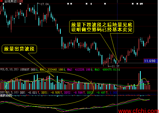 而从另一个放量来分析,由于已经没有做空筹码,极少的买盘就能够抵抗住股价的继续下跌。这时候,在走势形态上:成交量已经处于波段下跌以来的最低水平,且股价已经开始低位横盘整理,或开始低位小幅反弹。