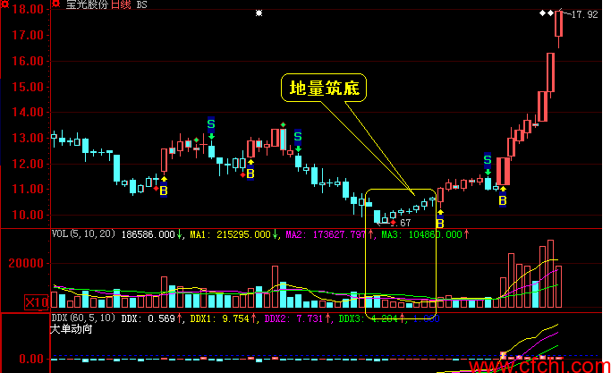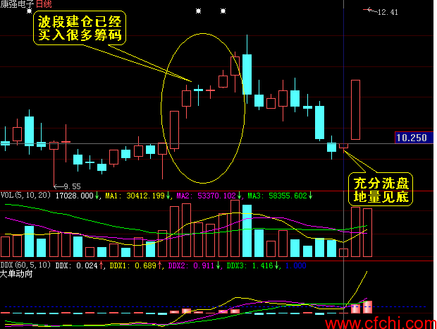 如下的案例,从DDE指标来看,2月24日至3月3日是放量建仓的波段,DDXDDY红柱都非常明显,成交量也很大。之后连续缩量洗盘,至3月16日时成交量已经缩小到了极限,说明已经没有短线筹码愿意卖出,短线筹码清理非常充分。而10元的价格位置是主力资金2月24日开始建仓时的最低成本。显然已经到了极限低点。