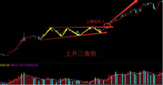 股票上升三角形,是股价在某水平呈现当正当强大的卖压,价格从低点回升到水平便告回落,但市场的购买力十分强,股价未回至上次低点即告弹升,这情形持续使股价随着一条阻力水平线波动日渐收窄