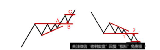B点是价格在突破后的回踩确认,如果B点不再跌回三角形内部,那么才可以继续买入。当价格上涨超过前一高点时即图中的C点,可以继续加仓买入。当然,B点并不必然会出现,在市场相当强势的时候,价格在突破A点后就一路上涨了。图中右侧是下降三角形的示意图,图中的1、2、3分别为卖出点,其操作要领刚好和上升三角形相反。