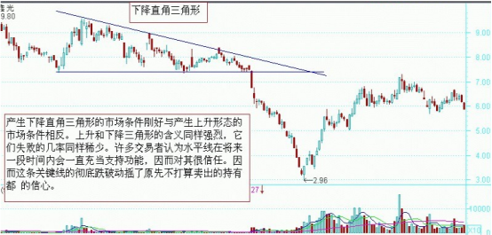 股票下降三角形底边低点墓本不变,下降三角形而顶边高点却越来越低,价格变动区间由大到小.由宽变窄。成交量从左到右逐步递减,形态内包含涨跌多次波动循环。下降三角形该形态末端的价格波动幅度较小.成交里大幅鉴缩。股价向下突破后常伴有间抽底边下轨现象。要注愈的是:下降三角形的成交盆一直十分低沉.突破时不必有大成交量配合。