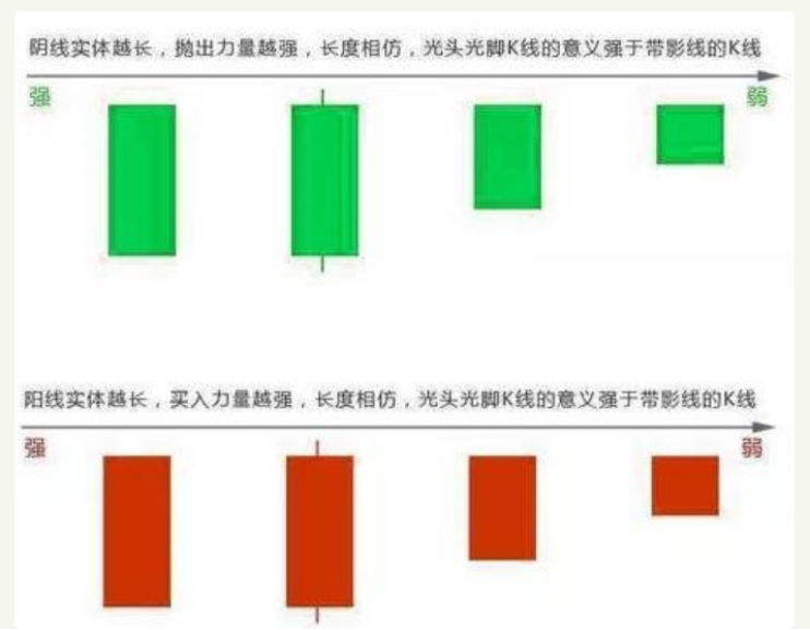 下影线:在K线图中,从实体向下延伸的细线叫下影线。在阳线中,它是当日开盘价与最低价之差;在阴线中,它是当日收盘价与最低价之差。光头光脚的阳线和阴线:既没有上影线也没有下影线的阳线和阴线。