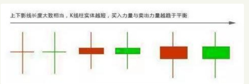 4、上下影线长度大致相当,实体越窄,多空力量越趋于平衡。