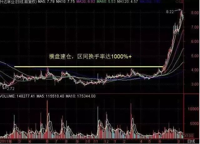 这类股票一般都是当前阶段的冷门股,在相对于它过去的较低的价格上进行箱形盘整,与大盘的趋势一致,成交量很小。因此在建仓阶段,尽量不能让人察觉有大资金介入,在操作上不能大手笔地明码执杖地买入,而必须将大资金拆小,这对于资金量大的机构庄家来说,相对建仓时间会较长,因而也必须要有足够的耐心和耐力,因为在底部吸的筹码越多,其建仓的成本越低。通常在低位盘整时间越长,则未来涨幅越大。
