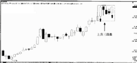 2、在三法形态中,下面这项因素可能加强其预测意义:如果头、尾两根白色K线的交易量超过了中间那群小K线的交易量,那么,该形态的分量就更重了。