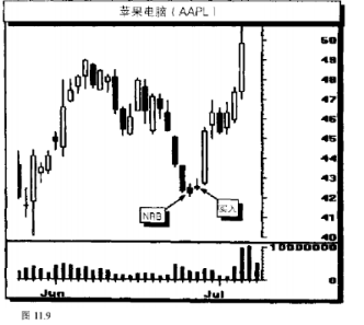 如果XYZ公司的股票星期一最高22美元,最低20美元,这一天的范围是2美元,第二天,XYZ在21美元和21.5美元之间,那么就可以被认为是一根小阳线、小阴线,看一看图11.6和11.7的例子。