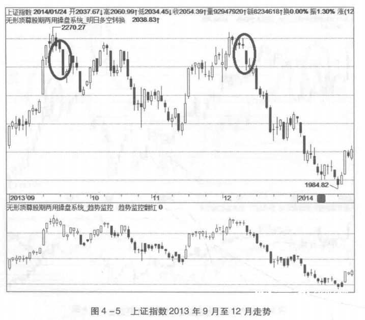 在图4-5中,2013年9月至12月,指数出现了震荡形态较为复杂的走势,在这种较为复杂的震荡行情中想要实现赢利,就一定要具备较高的把握波段的能力。否则,一买就是高点,一卖就是低点。