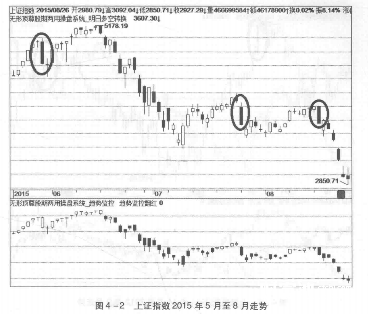 在图4-2中,2015年5月28日指数出现大幅暴跌的走势,创下牛市以来的最大跌幅,但是,大阴线出现之后指数并未连续下跌,而是继续反弹创出新高,当时的走势迷惑了不少的投资者,而无形当时判断,“这是顶部大阴线,它拉开了顶部形成的序幕”。