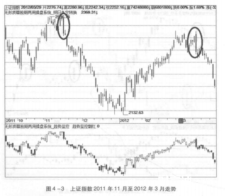 到了2012年3月,指数经过一番震荡上涨之后,再次于高位形成震荡的形态,而后一根大实体的阴线再度从空而降,这一根大阴线与底部上涨时的大阳线实体非常一致,这说明随着指数的不断上行,空方的力量变得越来越大,并且已经具备扭转趋势的能力。