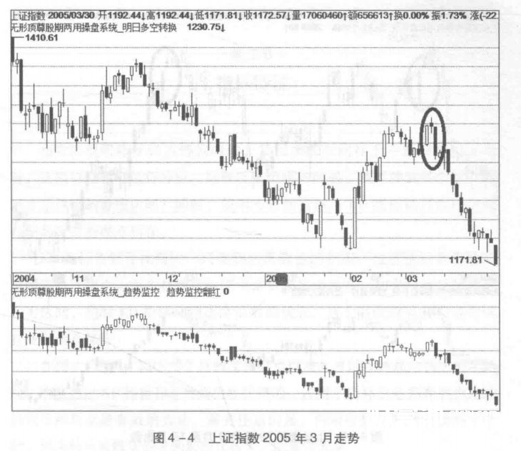 在图4-4中,2005年2月上证指数出现了一轮反弹的走势,在上涨的过程中,阴线的实体都比较小,这说明空方的力量非常弱,通过实体大小便可以得出结论:多方力度强大,指数上涨的概率也将会是非常大的。