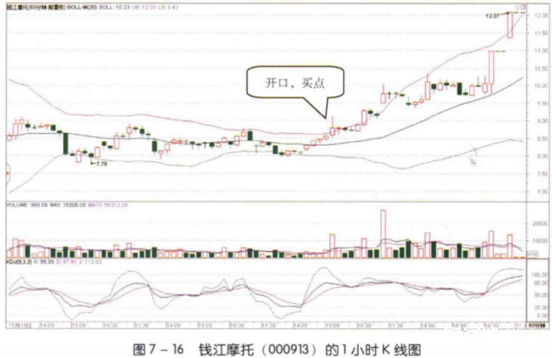 如图7-16所示,11月4日盘中,钱江摩托股价完成了对BOLL指标中轨的突破,之后BOLL指标上轨向上移动,下轨向下移动,开口逐渐打开。这样的形态说明该股即将进人强势上涨的行情中,未来将会持续上涨。看到这样的形态时,投资者可以坚定对于看涨行情的判断,积极买入股票。