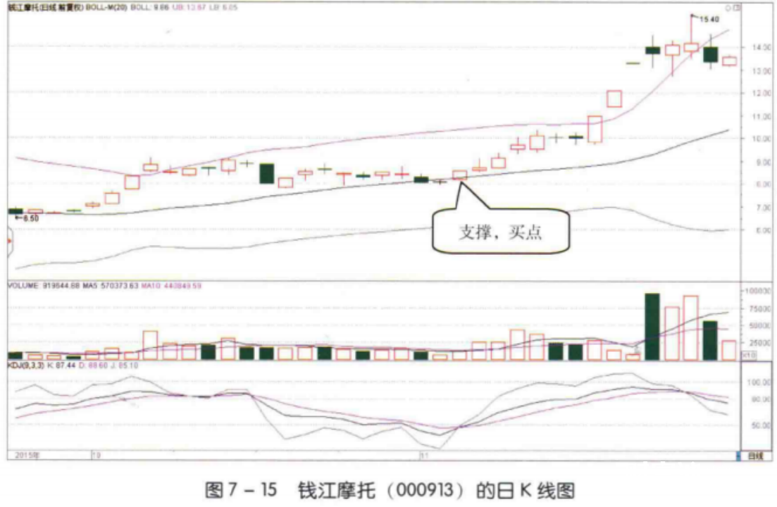 如图7- 15所示,2015年10月,钱江摩托(000913)股价沿着BOLL指标上轨和中轨之间的通道持续上涨。11 月4日,股价回落至BOLL指标中轨附近时获得支撑继续上涨。这次获得支撑说明股价仍处于持续的上涨行情中,是投资者买入股票的机会。