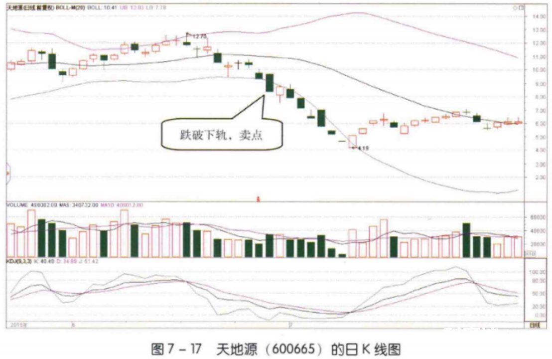 如图7-17所示,2015年6月29日盘中,天地源(600665) 股价跌破BOLL指标下轨,同时BOLL指标开口敞开。这样的形态说明该股股价即将强势下跌,投资者应该尽快卖出手中的股票,回避风险。