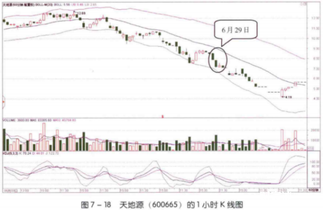 如图7-18所示,6月29日,天地源股价已经于BOLL指标中轨和下轨的通道间持续下跌。这样的形态验证了该股股价正在持续下跌的信号。得到日K线图和1小时K线图中看跌信号的反复验证后,投资者应该尽快卖出手中的股票。