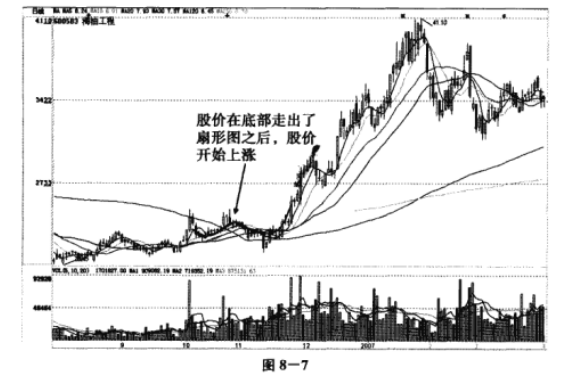 例如海油工程(600583) 2006 年10月份至12月份的K线走势图就是扇形走势,见图8一7: