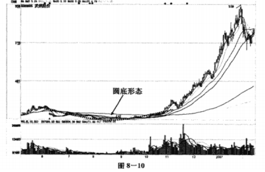 通常圆底是这样形成的:股价自高位回落一段时间后,开始上升,但它不是立即上升,而是在低位缓缓上升,在图形上形成一个圆形的底部。例如2006年7月至11月武钢股份(600005)的K线走势图,就是典型的圆底形,见图8-10: