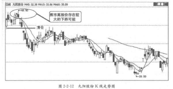 如图2-2-12,2008年6月,九阳股份(002242) 在大盘指数处于弱势状态下,首日股价的上涨价格非常高,虽然这类个股不排除有短线上冲可能,但在大背景走弱的情况下,这类高价股中线下跌的可能性极大。