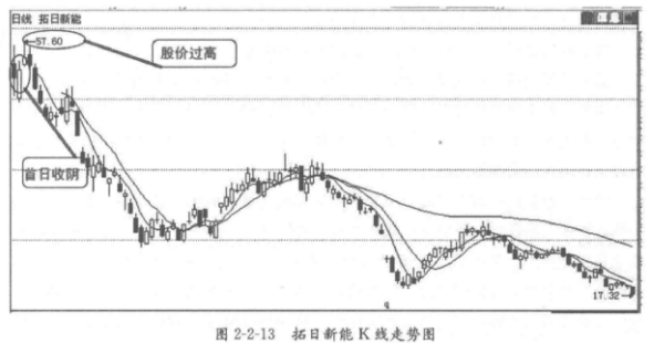 如图2-2-13,拓日新能(002218) 2008 年2月28日上市后,在指数弱势环境中上市、上市价格过高、首日收出阴线,这三大基本特征决定股价上涨困难重重。