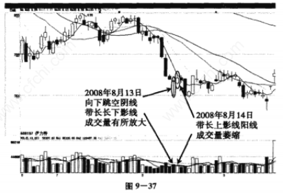 如图9-37所示,该股连续拉出7条阴线,股价大幅下跌,随后向下跳空收出一条带长长下影线的类似十字屋的阴线实体,同时成交量有所放大。