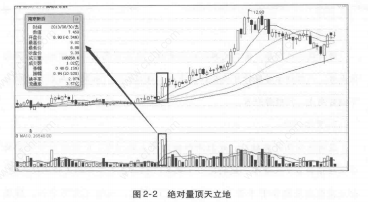 股价单日放出天量光头阳线,预示该股有潜在题材,其特征是单日成交量异常放大几倍甚至十几倍,超出几个月甚至一年任意单日最大成交量几倍(图2-2)。要注意的是,如果是大幅走高以后放巨量,则有可能是主力对倒;如伴随利好消息,则有可能是主力借机出货。