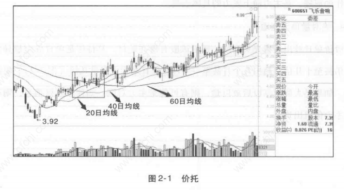 股价经过一段时间的下跌与盘整,中长期均线逐渐走平,20日均线开始上穿40日均线,并向60均线挺进,而40日线也掉头向上,后期的发展就会逐渐形成一个对股价有支撑作用的三角形均线组合,这就是价托(图2-1)。价托形成后一般会支撑股价继续上行一段时间。但价托的滞后性比较明显,因此应当在其即将形成时就考虑逢低介入。