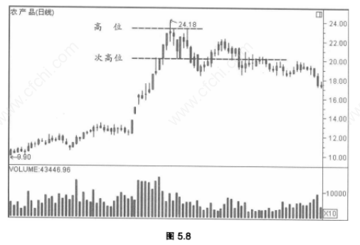 在次高位长时间出货,主力在高位长时间盘整后,股价向下跌的概率较大,也有诱多的主力,故意再次拉升股价,让投资者产生错觉,以为股价还要涨,一直犹豫的投资者看到股价再次上涨,经不住诱惑开仓买进。等大量跟风盘开始接货,主力则大肆出货,股价则会出现急跌走势,将在高位震荡时盲目追进的散户一网打尽(图5.8)。