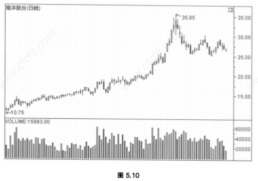 图5.10是南洋股份日K线走势图,该股由底部启动,经过缓慢攀升,冲高至35.65元,总体涨幅已超过100%,主力获利丰厚。随着主力不断抛售筹码,股价大幅下跌,当股价回落到25元的位置止跌,展开长时间震荡盘整,此时与35元的高位相比确实便宜了不少,主力利用这种视觉价差的假象,趁机在次高位震荡出货。