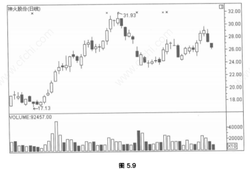 图5.9是神火股份日K线走势图,股价由17. 13元启动后,震荡盘升,冲高到31.93元后,股价连续几个交易日回落,当股价回落至24元时,股价止跌,主力制造股价还会再次上涨的假象。股价在26元的区间反复冲高回落,主力利用投资者贪图便宜的心理在这个位置反复进出,吸引普通投资者在这个位置接盘,达到出货的目的。