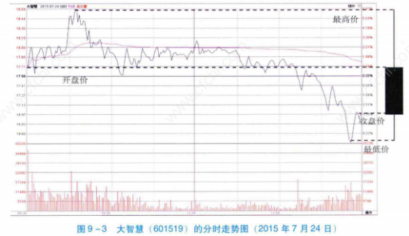 如图9-3所示,2015年7月24日,大智慧(601519) 小幅高开后在盘中大幅震荡,最终以低价收盘。根据这样的分时形态,投资者就可以推断出当日的K线形态是一根带有长上影线的阴线,如图中右侧所示。
