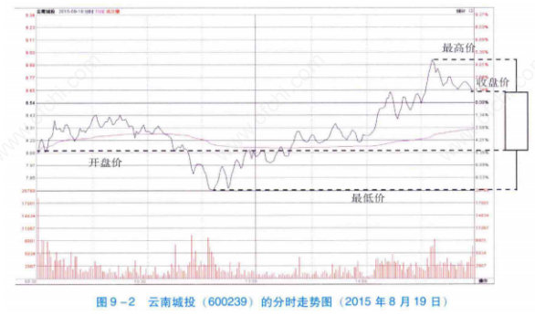 如图9-2所示,2015年8月19日,云南城投(600239)低开后经过持续震荡,最终在高位收盘。根据当日的分时走势,投资者就可以推断出当日的K线形态是一根带有上下影线的阳线,如图中右侧所示。
