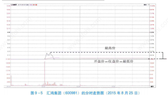 如图9-5所示,2015 年8月25日,汇鸿集团(600981) 以跌停价格开盘。虽然盘中跌停板被打开,但最终还是被封在跌停板上,并以跌停的价格收盘。这个交易日的开盘价、收盘价和最低价相等,最高价较前三者高。因此,对应的K线形态是一根倒T字线,如图中右侧所示。