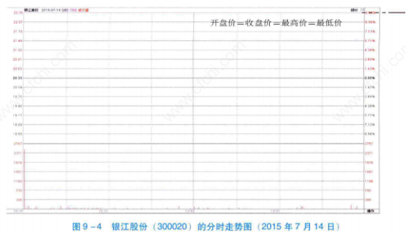 如图9-4所示,2015年7月14日,银江股份(300020) 开盘后一直保持涨停的价位直至收盘。当日该股的开盘价、收盘价、最高价和最低价相等。因此,对应的K线形态是一根一字线,如图中右侧所示。