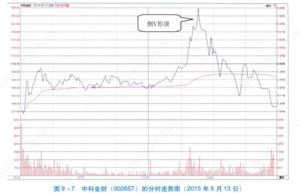 如图9-7所示,从该股当日的分时走势中可以验证以上的判断。当日开盘后,该股在很长的一段时间里一直在低位持续横盘整理,直到下午开盘后才迅速冲高。但股价冲高后就遇到了巨大的抛盘压力,开始持续下跌,在高位形成了一个倒V形顶的走势。根据之前讲的分时形态,这是一个强烈的看跌信号。