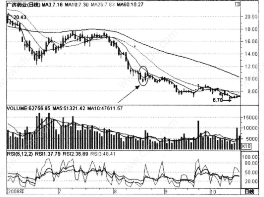 如下图,广济药业( 000952 )的股价经过一波上涨后冲高回落,在下跌过程中出现两个非常标准的早晨之星形态。纯粹从走势图来看,如果早晨之星成立,股价应快速上涨,似乎庄家要再做一波。但后来股价的发展否定了这个具有强烈看涨意义的早晨之星,而是在收了一根阴线后,接着出现连续的下行走势,早晨之星被淹没在漫漫阴跌之中。