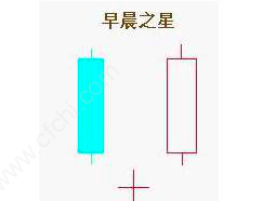 早晨之星预示股价见底,后市看好。它由三根K线组成,第一天由 于恐慌盘抛出而出现一根巨大的阴线大势不妙。第二天跳空下行,但跌幅不大,实体部分较短,星线可阳可阴。第三天一根长阳线拔地而起,收复第一天的大部分失地,股价转危为安。早晨之星出现在长期下跌之后、暴跌之后、上升回调后的准确率较高。