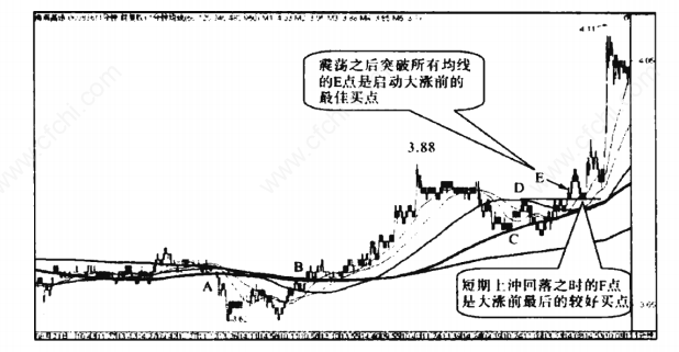 海南高速从3.88元下跌之后,在首次跌到480分钟均线附近的C点,然后反弹到240分钟均线处的D点,受阻再次回落,此次下跌只是短暂地略微跌破了480分钟均线之后就企稳开始上涨,又在240分钟均线附近震荡蓄势一段时间后,一举突破240分钟均线和前高D点的双重压力,图中的E点就是海南高速在各均线附近震荡突破开始大涨的起涨点,而突破之后回调时的F点就是启动大涨前最后的较好买点了。