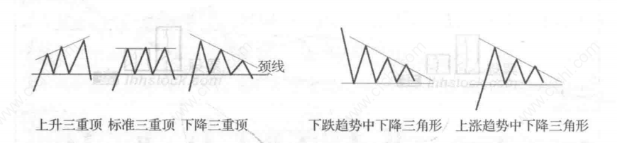 那么如果出现在下降趋势中,出现三个反弹高点,则不能称为三重顶了,因为它的前面有高点,如果三个顶逐个降低,只能称为下降三角形,而且是下跌趋势中的下降三角形。