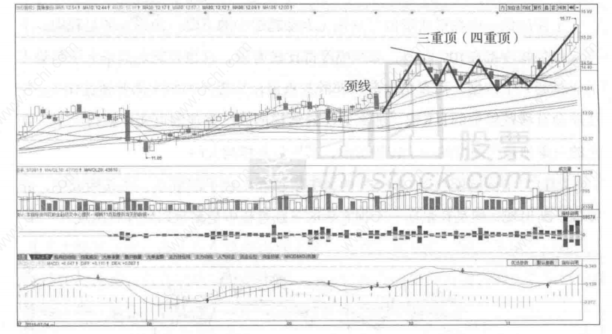 三重顶又称三尊头,比M头多一个头,三个头部与颈线的距离虽然大致相当,但也可以有一定的相差,一般认为在3%左右。