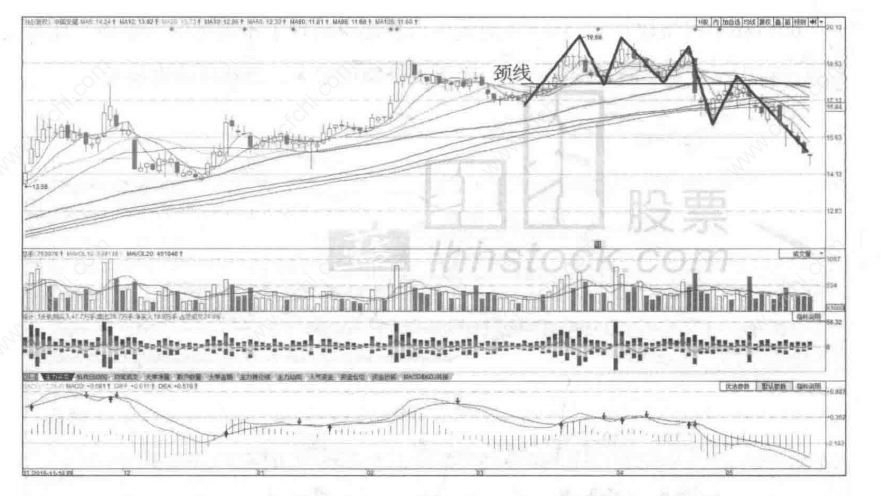 最低点的形成,往往是画颈线的重要依据。通常以它作为主要支撑线,当价格出现双顶后回落至接近颈线,然后再次反弹至原先双顶的位置,并遭遇阻力后回落。一般认为,若价格跌破颈线,股价便会大幅滑落,三重顶图形被确认。