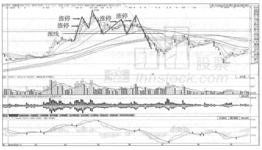 601186中国铁建在2015年5月的大牛市顶部也出现了不规则的三重顶,在其形成过程中,也是不断出现涨停板,上下震荡幅度很大,当然风险也很大。