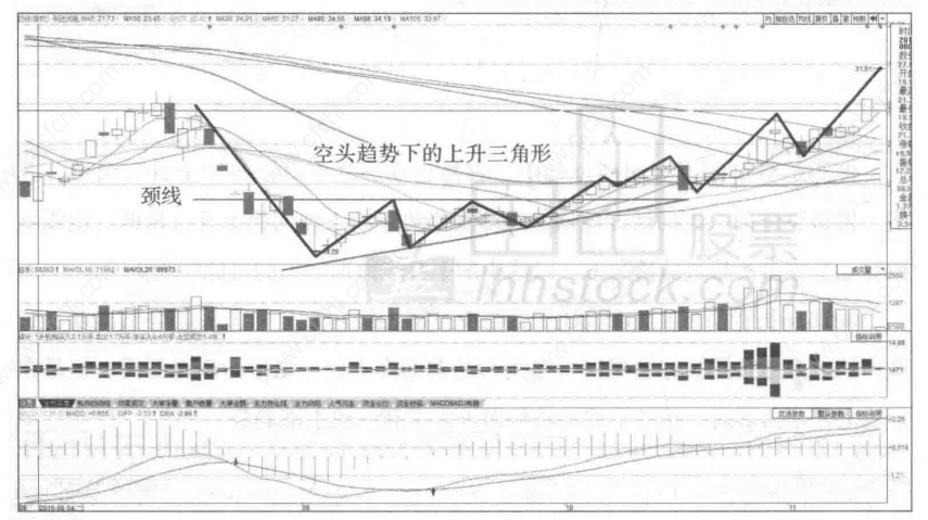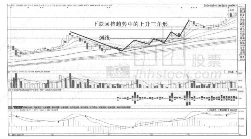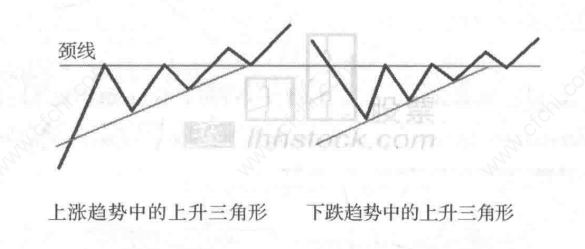 多头趋势下的上涨回档过程中,容易出现的是下跌趋势中上升三角形。其实,说得更正确一点的话,应该称为多头趋势下的下跌回档上升三角形。也就是说要还是在多头趋势的情况下,回档中的上升三角形产生的可能性大。