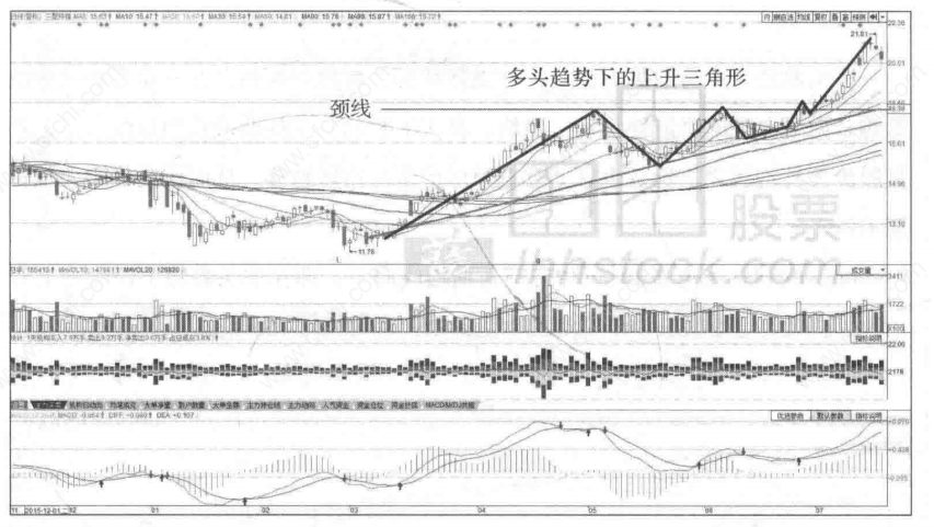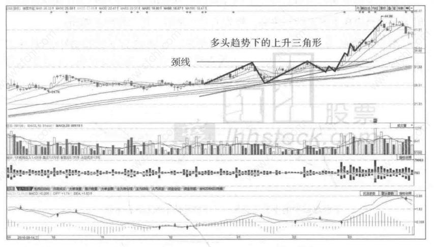 但是股价却没有跌到前期低点又重新回升,并且在突破颈线略作小幅回落后重拾升势。这就是上涨趋势中的上升三角形的形成过程。