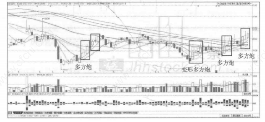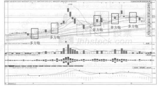 多方炮是由三根K线组成,一边一根中阳线,中间一根小阴线,即二阳夹一阴形成上攻态势,故称为多方炮,预示着多方即将开炮,股价即将上涨。具体形态如图: