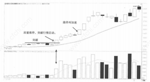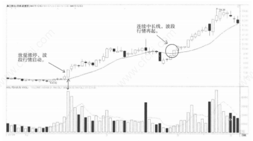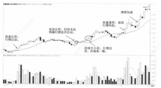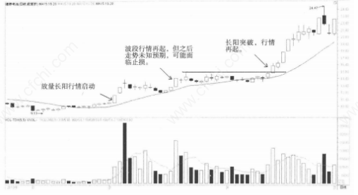 下面的图例可以让我们更清楚地了解到放量长阳线或者连续的中阳线对于行情的意义,以及给我们提供的交易机会,甚至还可以让我们了解到牛股初期的运行规律。
