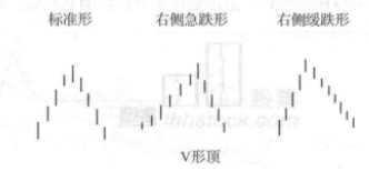 V形顶如图其形状像个倒V字,所以更正确的叫法应该叫倒V形顶。V形顶常见的有标准V形顶、左侧缓涨右侧急跌形、左侧急涨右侧缓跌形三种类型。