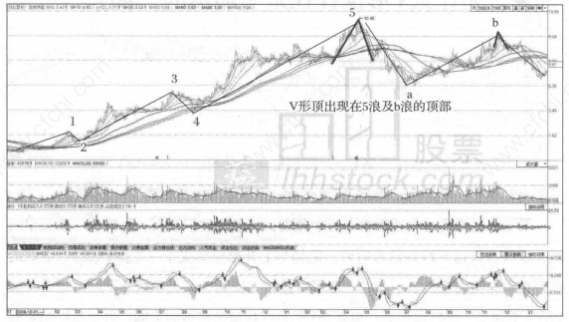 600481双良节能自2008年底开始的一.轮5浪上攻中,其实可以分为延伸7浪,姑且就看成5浪分析吧。股价在2009年底第5浪前作了近半年的平台,之后股价冲顶回落形成了V形顶,其实也就是头肩顶的头部部分。左肩较大较平,右肩较尖较陡。而在调整浪的b浪上涨中又出现了一个小的V形顶。